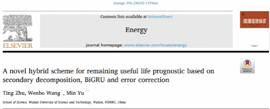 近日,公司博士朱婷、教授王文波、老师喻敏合作在《Energy》期刊上发表题为“A novel hybrid scheme for remaining useful life prognostic based on secondary decomposition, BiGRU and error correction”的研究论文。该期刊系JCR及中科院SCI双一区TOP期刊,2022年影响因子为8.857,该期刊重点关注能源经济分析、能源建模和预测、综合能源系统、能源规划和能源管理,是能源研究领域内最有影响力和最权威的期刊之一。朱婷博士为第一作者,王文波、喻敏为共同通讯作者,永利集团为第一单位。