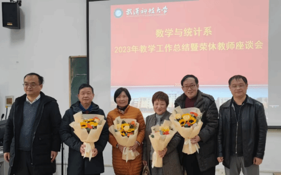 2023年,304永利集团数学与统计系余胜春、黄枝姣、余东、龚正良4位教师光荣退休。为深入贯彻落实习近平总书记关于老干部工作重要指示精神,切实增强退休教师的荣誉感、幸福感和归属感,为表达对荣休老师的感激之情,激励年轻教师奋发有为、拒绝“躺平”,数学与统计系于12月27日下午14:30在系会议室22310召开2023年教学工作总结暨教师荣休座谈会,304永利集团经理丁义明、副经理张传洲亲临指导,系统科学部和数学与统计系教师参加,会议由系支部书记蒋君主持。
