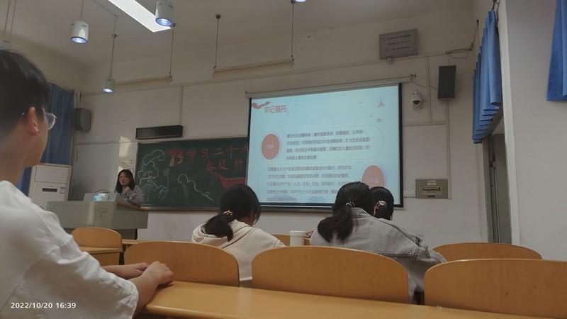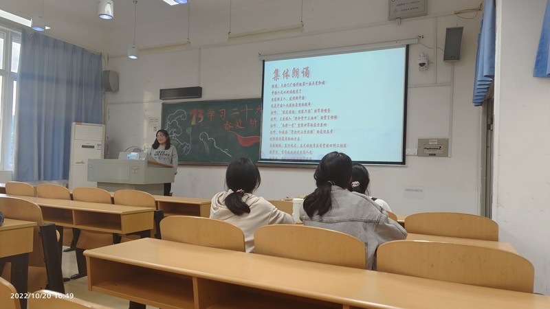 全班共34名同学参加了主题班会活动。班会在主持人陈焯对中共二十大的介绍中拉开序幕,随后共同演唱了《没有共产党就没有新中国》。演唱过后,由陈焯从“二十大新征程”“中坚力量”“牢记嘱托”“砥砺奋斗”四个层面来讲述“个人如何将青春奋斗与国家奋斗的伟大历程相结合,让青春在时代背景下绽放绚丽之花”。同学们也了解到了中国共产党的中心任务、基本原则,对中国共产党的伟大贡献做出了高度赞扬。