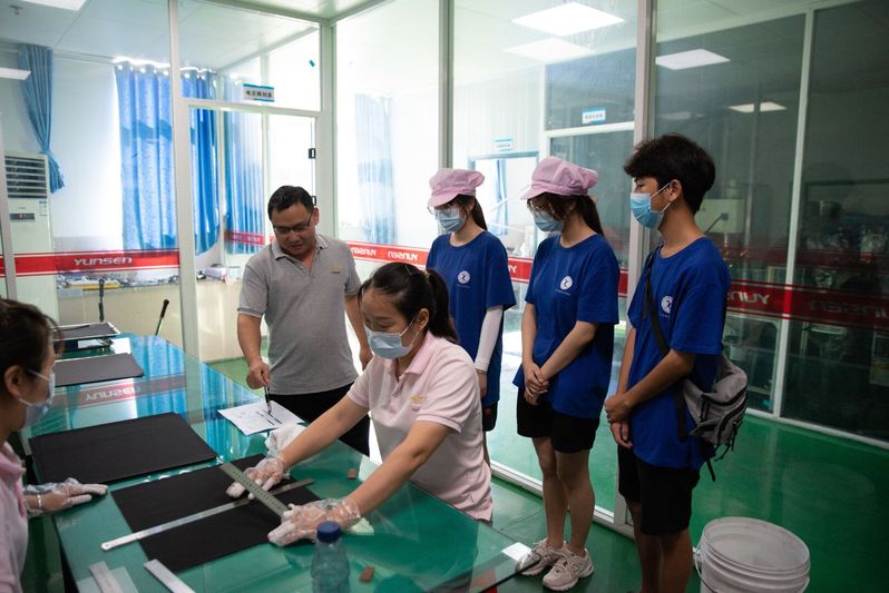 研发中试线上,两位工作人员手持两把平行钢尺相对而坐,他们在垂直方向上固定尺寸后,挪动专用刮刀刮下黑色粉末,与此同时向实践成员们介绍这一极片的制作过程。从接受业务到样品合格,样品电池的打样环节需要历经制片、点焊、卷绕补电测压等14个流程。据实践成员们了解,物料测试环节决定着电池百分之七八十的性能,是其中最为重要的一环。
